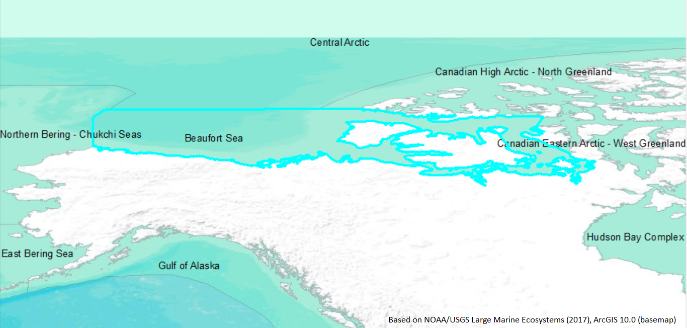 The Beaufort Sea is a high latitude ecosystem situated off the coast of northern Alaska, in the United States, and of the Northwest Territories, in Canada. It is covered with ice for most of the year. The Beaufort Gyral Stream forms a clockwise drift pattern. The LME is driven by changes in the Arctic climate and is based on distinctive ecological criteria such as bathymetry, hydrography, productivity, and trophodynamics (http://na.nefsc.noaa.gov/lme/text/lme55.htm). Formerly in part of Arctic Archipelago (LME 2008). |