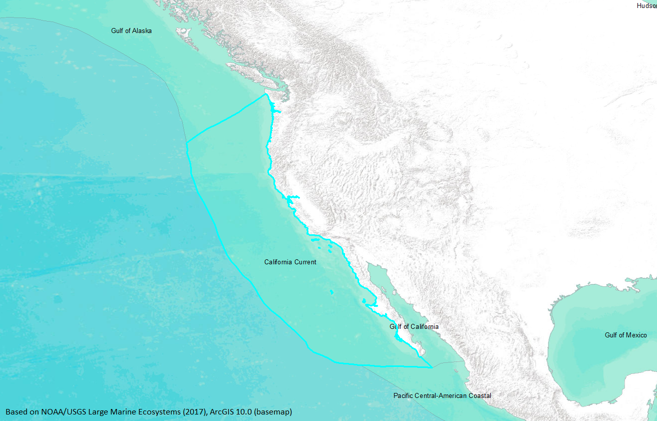 The California Current flows south along the west coast of North America, extending from the Columbia River to central Baja California. (MacCall, 1986). The California current is a classic eastern ocean coastal upwelling system with a narrow to moderate continental shelf and generally broad, diffuse, equatorward surface flow. (Wooster and Reid, 1963; Parrish et al., 1983) The California Current forms the eastern limb of the North Pacific Subtropical Gyre, flowing equatorward off the western United States and northern Mexico, exhibiting a mixture of filaments, mesoscale eddies, and counterflows. Wind-driven surface Ekman transport away from the coast is superimposed on the geostrophic current, resulting in upwelling centered near Cape Mendocino in northern California and off Baja California (Punta Baja) during the spring and summer. (Reid et al., 1958; Bakun, 1993; Bakun and Nelson, 1977) Major eddies occur in the warmer Southern Califorina Bight (SCB) south of Point Concepcion, which is influenced by islands, and in Sebastian Viczaino Bay, Baja, California. (MacCall, 1986) (http://www.na.nmfs.gov/lme/text/lme3.htm) |