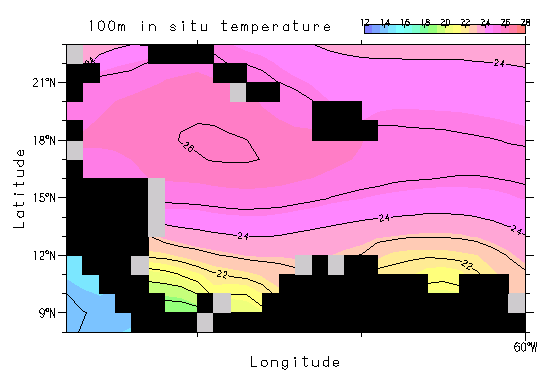 The Caribbean is comprised of four deep basins: Venezuelan Basin in the east, which is partially separated by a ridge from the Columbian Basin in the west, the Cayman Trough in the northwest (in between Jamaica and Honduras), and the Yucatan Basin north of the Cayman Trough. It is marked by narrow and relatively shallow entrances, with the Yucatan Channel the only one greater than 1,800 meters. Half of the water in the LME is deeper than 3,600 meters, and 75% is deeper than 1,800 meters (Richards and Bohnsack, 1990). The trade winds strongly influence the circulation, which is generally a westward flowing surface current with some upwelling along the South American continent. There is not much seasonal variation in surface water temperatures, which range from 25.5 degrees Celsius in the winter to 28 degrees Celsius in the summer.