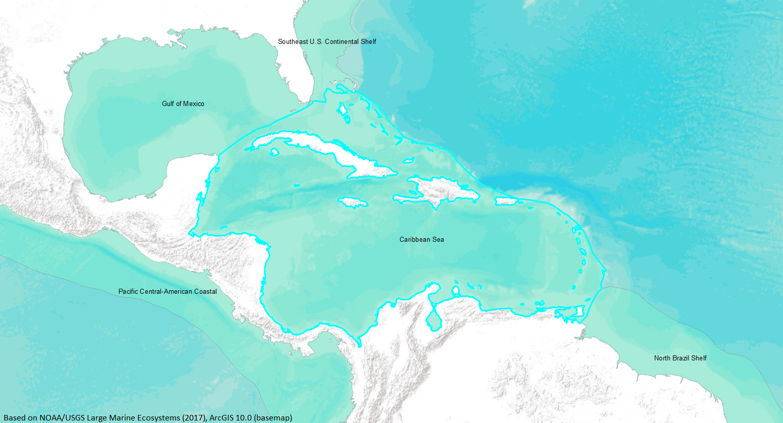 Nearby areas with similar marine fauna include the Bahamas, Gulf of Mexico, Straits of Florida, Bermuda to the north, and the northern coast of South America to the mouth of the Amazon River to the east. There is good background information available on this area thanks to a multidisciplinary study called the Cooperative Investigations in the Caribbean Sea and Adjacent Areas (CICAR), completed during the 1970’s (Richards and Bohnsac, 1990) (http://www.na.nmfs.gov/lme/text/lme12.htm). |