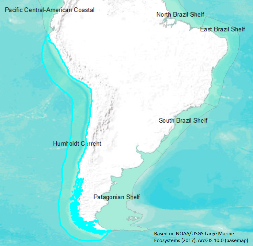 The Humboldt current ecosystem is one of the major upwelling systems of the world. As with other eastern boundary currents, the Humboldt current system is predominantly an equatorward flow of cold, low salinity water with complex flows and counter-flows out to 1,000 km from the Peru-Chile coast. The Chile-Peru Oceanic current is a sluggish (0.04 m/s), wide flow toward the equator that coincides with the boundary of the anticyclonic gyre of the Southeast Pacific. (Robles et al., 1990) Shoreward of the Chile-Peru Oceanic current, the Peruvian Oceanic Countercurrent flows southward at approximately 0.06 m/s. (Wyrtki, 1967) The faster Humboldt Current is closer to the coast, approximately 300-400 km offshore, with velocities at 200 m depth greater than 0.18 m/s. Another southern counterflow occurs at 100 m depth off Peru and 200 m depth off Chile. The Gunther Current is another southern flow occurring at 100 m depth off Peru and 200 m depth off Chile. It is low in oxygen (less than 1 ml/l) and nutrient rich. (Brockman et al., 1980; Robles et al., 1990; Alheit and Bernal, 1993) (http://www.na.nmfs.gov/lme/text/lme13.htm). |