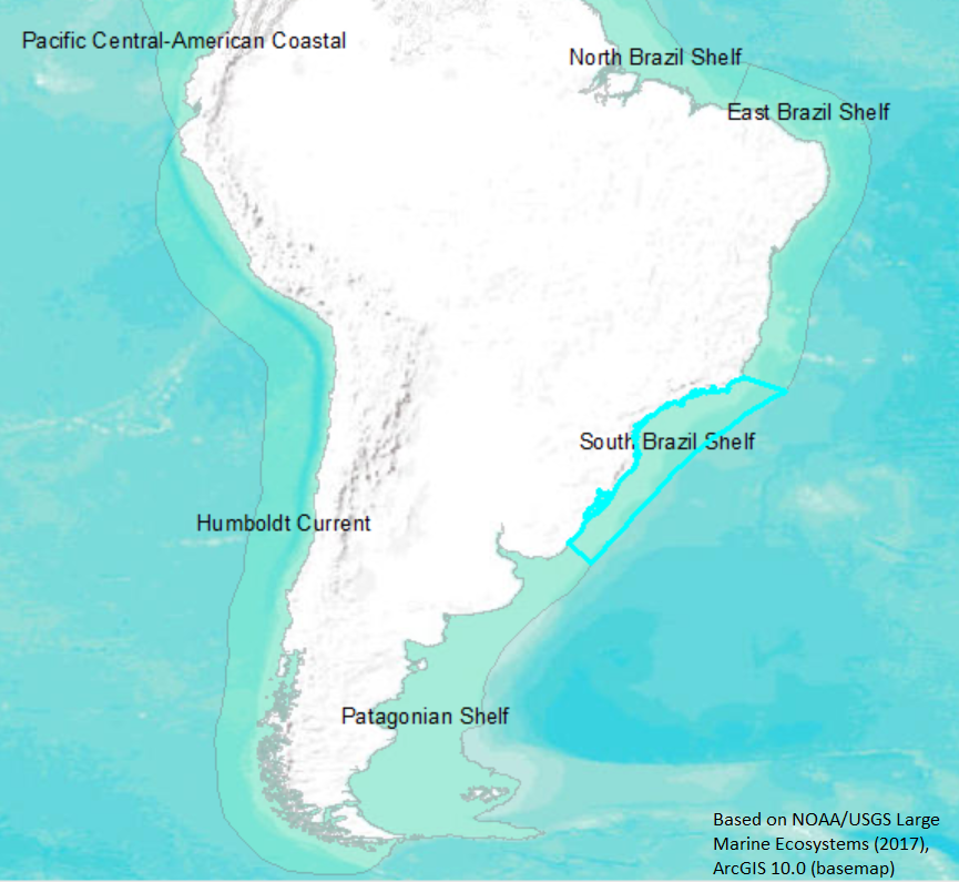 The South Brazil Current LME, defined as the area influenced by the current for which it is named, lies off the southeast coast of Brazil. The LME is controlled mostly by shelf topography, in some places up to 220 km wide (http://www.na.nmfs.gov/lme/text/lme15.htm). |