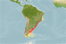 ; djupintervall 10 - 100 m (Ref. 83435). Subtropical, preferred 22°C (Ref. 107945); 12°S - 56°S, 76°W - 37°W (Ref. 112047)